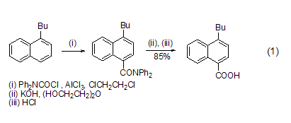 羧基的引入 在AlCl3催化下,DPC-Cl 可在芳環(huán)上引入一個羧基。烷基或烷氧基取代的芳環(huán)容易發(fā)生反應。產物二苯基酰胺用堿水解,再酸化可得到羧酸 (式1)[1]。