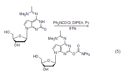 用作寡聚核苷酸合成時的保護基 在合成寡聚核苷酸時,鳥嘌呤核苷的堿基容易發(fā)生副反應,需要加以保護,DPC-Cl可以將鳥嘌呤堿基的烯醇異構體酰基化而對其進行保護,這種方法在合成具有鳥嘌呤堿基和與鳥嘌呤堿基類似的核苷化合物時[9~12],發(fā)揮著重要作用 (式5)。